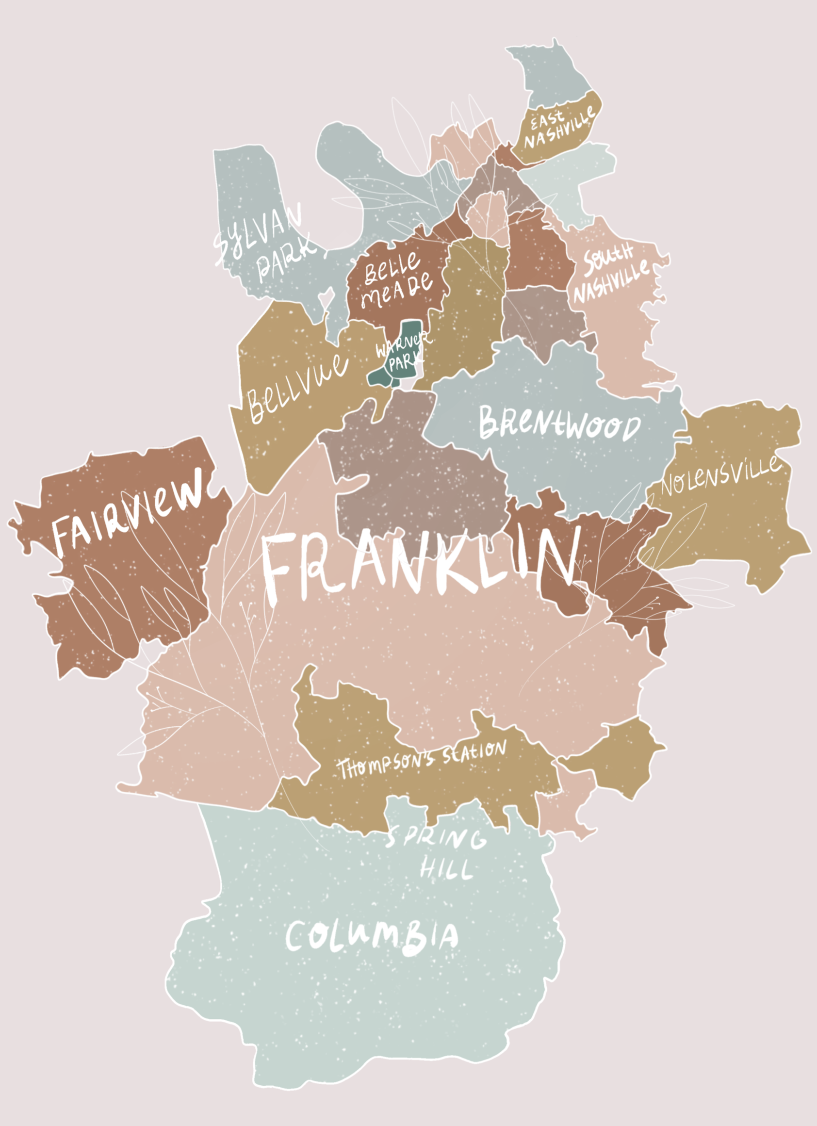 From the rolling hills of Middle Tennessee to the hush of bedside vigils, my in-person death doula work roots itself in Nashville, Franklin, and the communities that surround them. The hand-drawn map marks the land where I offer direct, embodied end-of-life support.