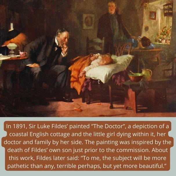 Do we learn something about Death from considering it in art? Do we learn something about the universal stance of humans to hope for this fragile peace, attended to by our doctor in our own home, grieving loved ones at our side? If we were to paint a modern version of “The Doctor”, over 100 years later, what would it look like?
