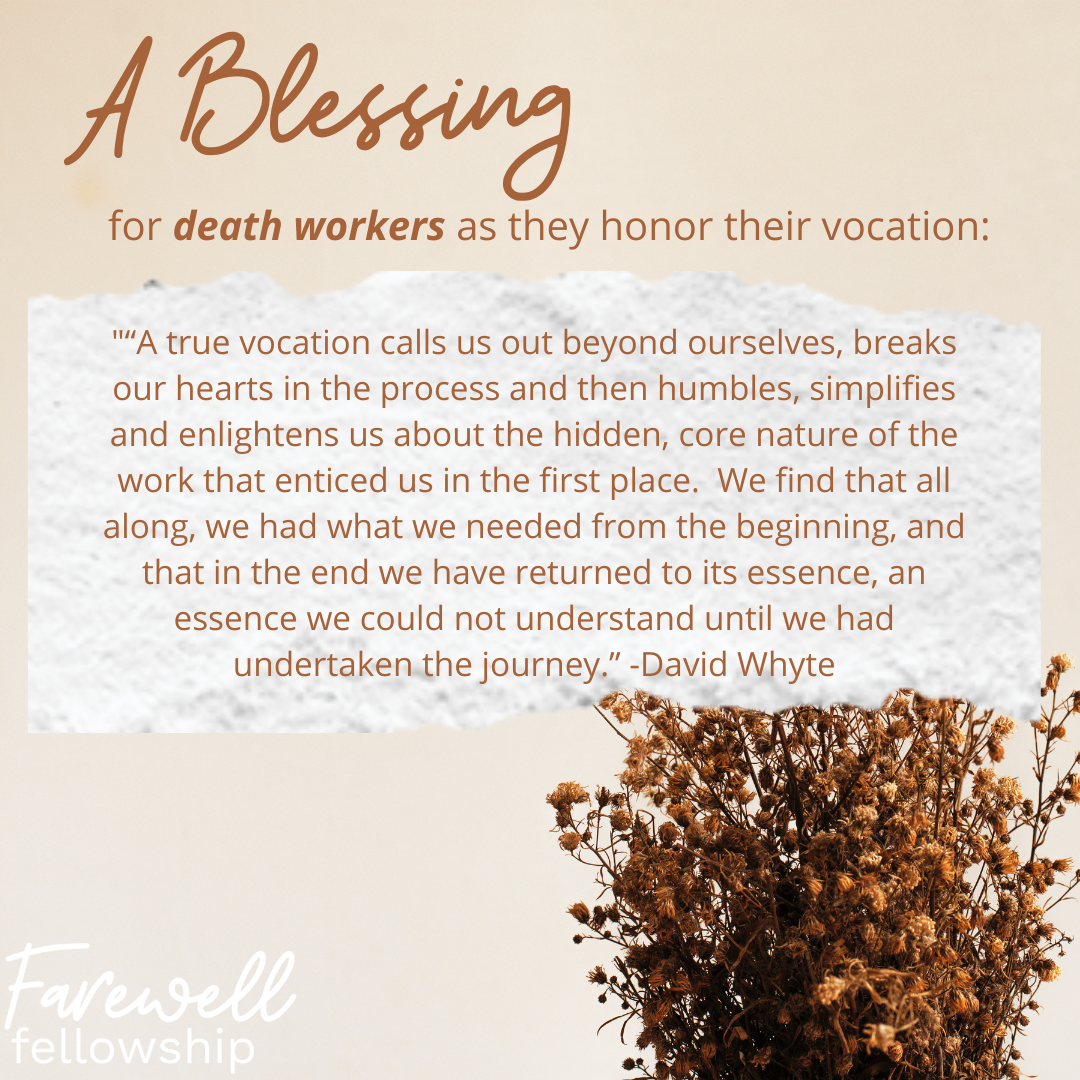 Today, in gratitude for the way death workers respond with their true answers to my very hard and provocative questions, I too offer David Whyte’s words as a blessing to us.