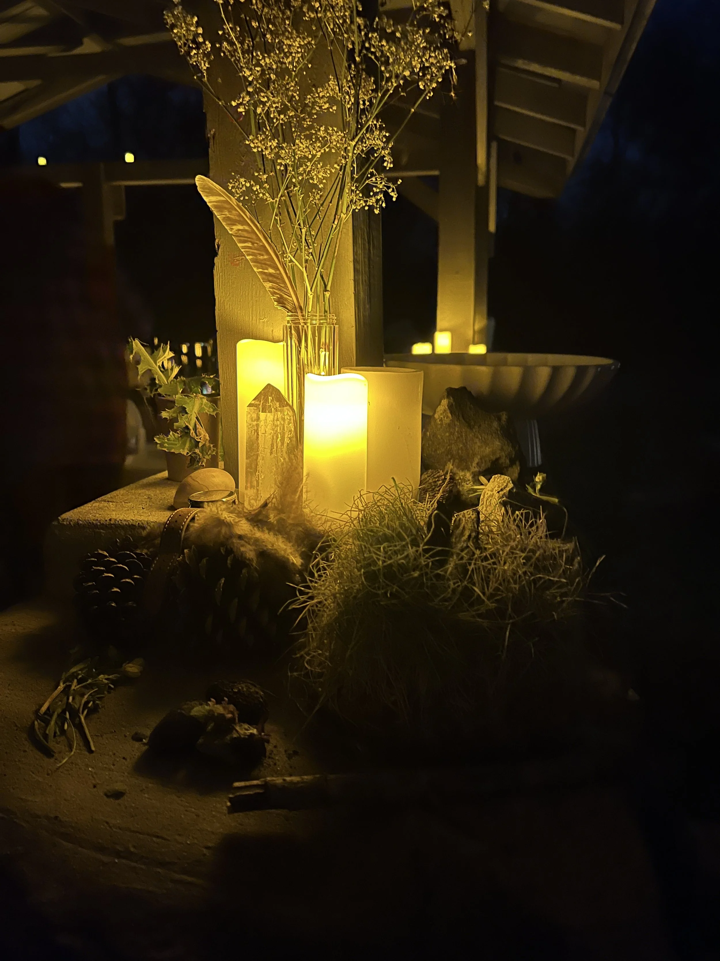 Candles flickered to life. Altars were built from feathers, pinecones, stones, and small objects brought from home, each one a quiet acknowledgment of what we carried. We opened with the sound of the “hu,” each voice entering at its own pitch, weaving together into something ancient and shared.